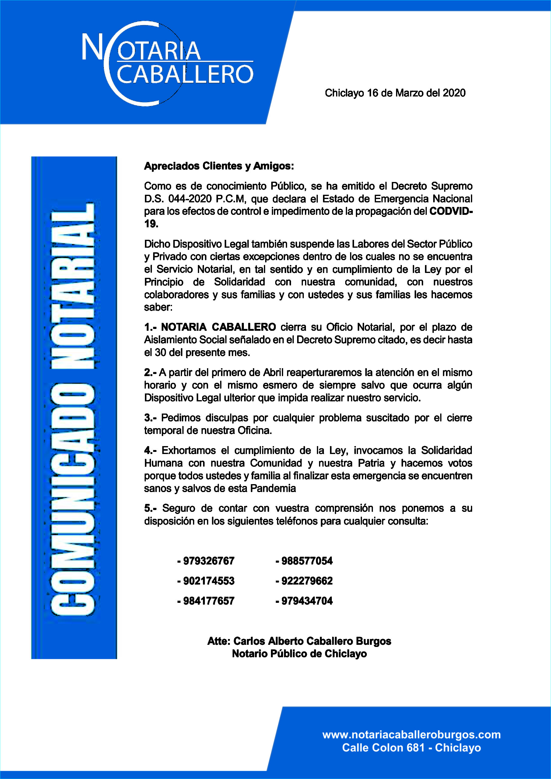 Chiclayo 16 de Marzo del 2020 Apreciados Clientes y Amigos: Como es de conocimiento Público, se ha emitido el Decreto Supremo D.S. 044-2020 P.C.M, que declara el Estado de Emergencia Nacional para los efectos de control e impedimento de la propagación del CODVID-19....